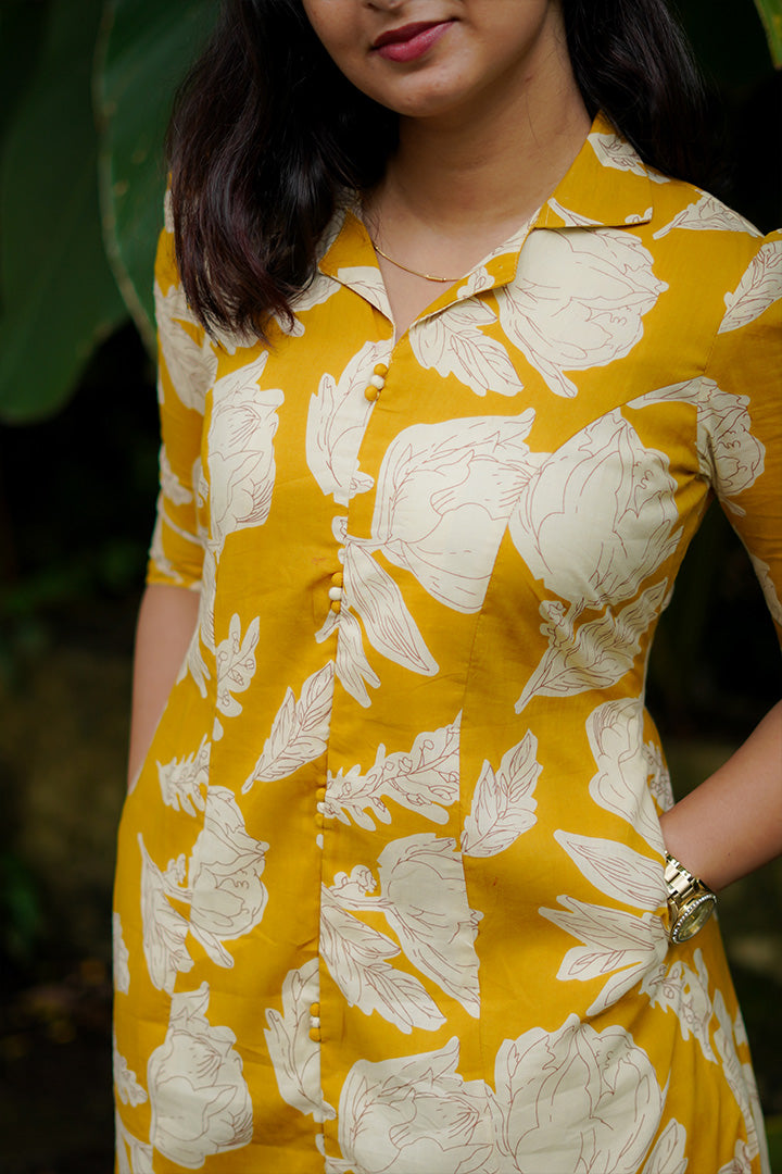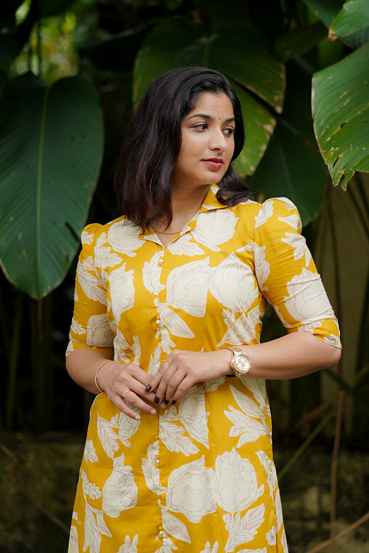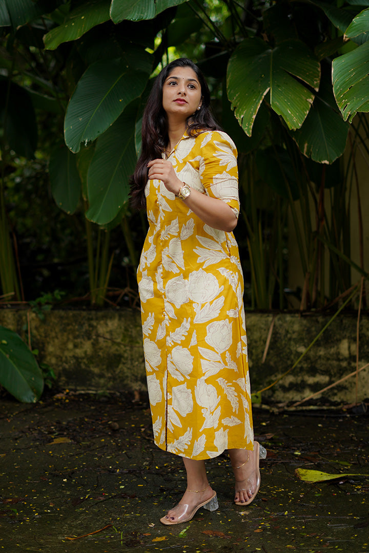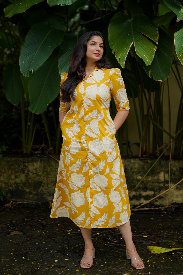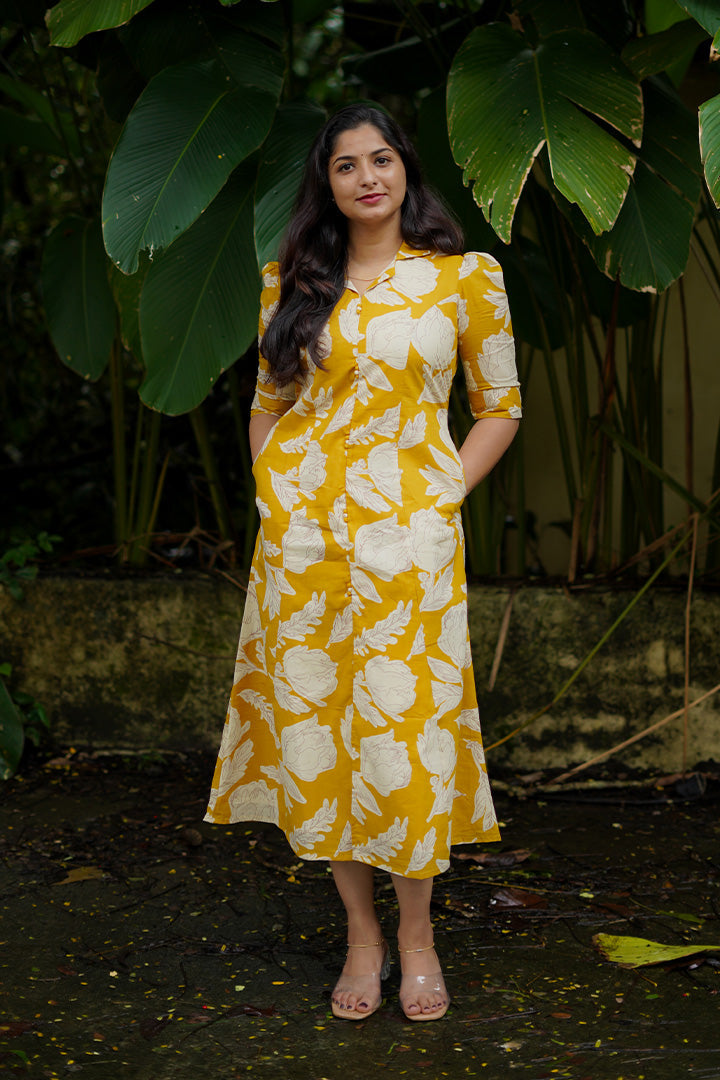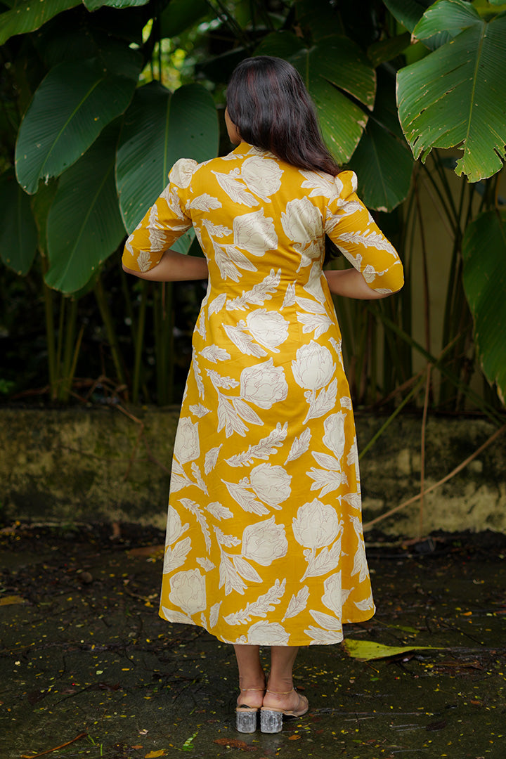 Mustard Cotton bloom Midi Dress